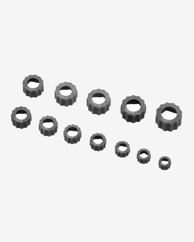 Alat za skidanje oštećenih matica. Dimenzije: 8 – 9 – 10 – 11 – 12 – 13 – 14 – 15 – 16 – 17 – 18 – 19 mm. Može da se iskoristi kod 65% okruglih matica.