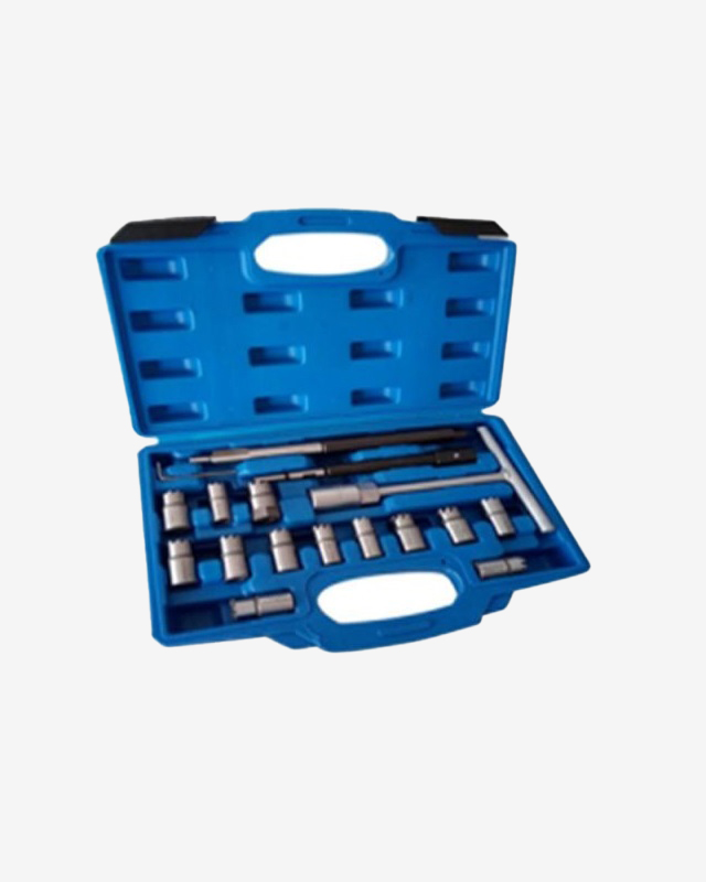 Set za čišćenje i obradu ležišta dizni dizajniran je za preciznu pripremu i restauraciju mesta gde dizna naleže u glavi motora. Namenjen je servisnim radionicama i mehaničarima radi uklanjanja naslaga, nečistoća i korozije, kao i poravnavanja površine ležišta pre ponovne montaže dizne. Kvalitetna konstrukcija alata omogućava stabilno vođenje i precizan rad, smanjujući rizik od curenja i nepravilnog zaptivanja dizni.